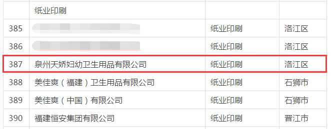 熱烈祝賀泉州天嬌婦幼衛生用品有限公司入選泉州市2017龍頭企業